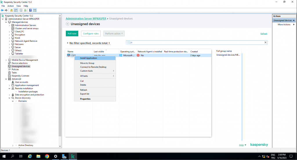 Hedef bilgisayar test bilgisayarımı active directory senkronizasyonu unassigned devices kısmında bilgisayarları poll ettikten sonra seçtim.