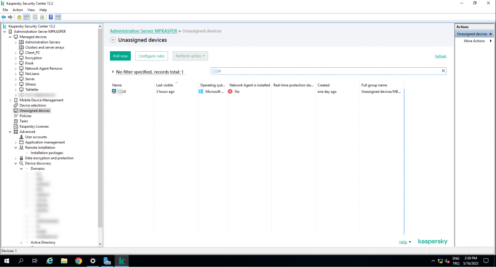 AD ile senkronize edilmiş olan Kaspersky Security Center MMC üzerinden hedef bilgisayara security center ile haberleşme için geken Network Agent Kurulumunu adım adım göstereceğim.